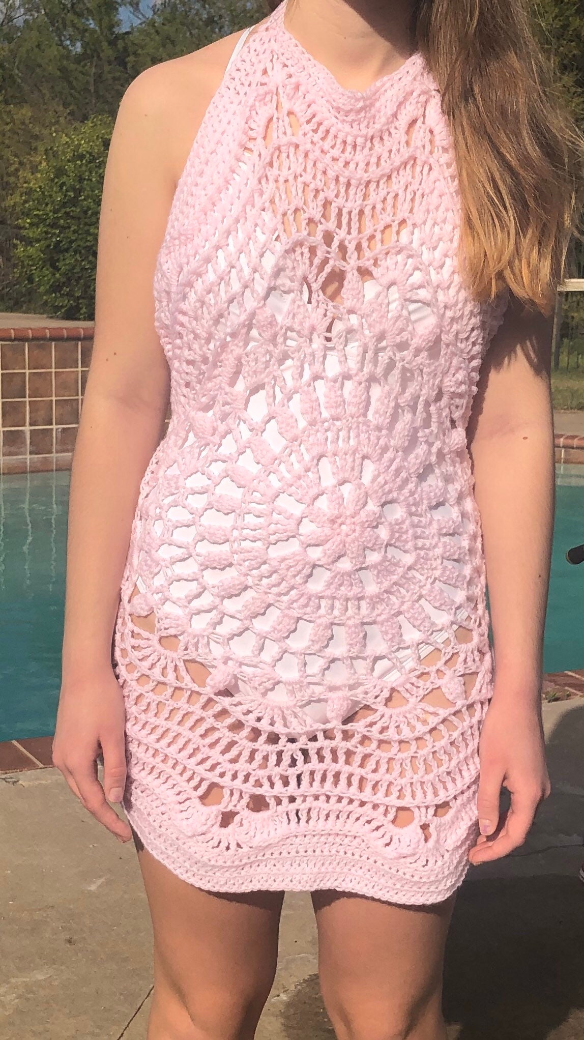 This is a crochet pattern to help you create this unique and detailed bathing suit cover! The cover slips on and features straps at to top to tie around the wearers neck.